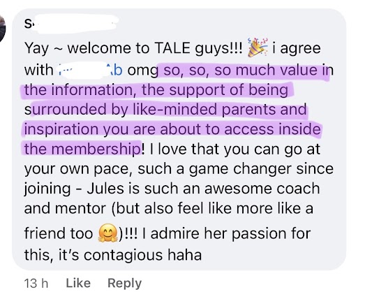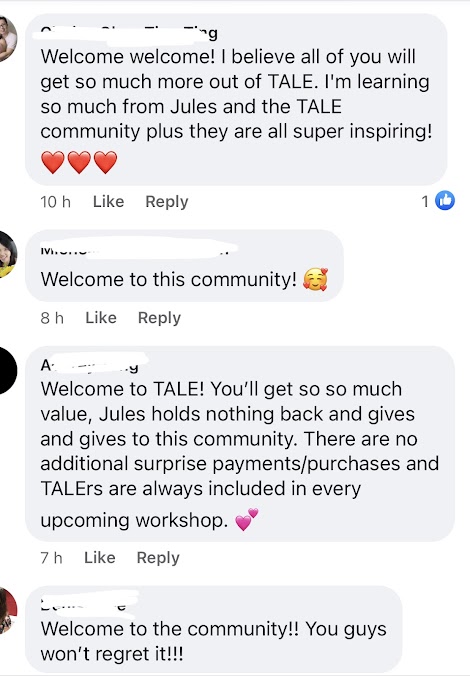 We've designed TALE to support you and to meet you at exactly where you are! We have monthly Q&A livestreams where we stay on to answer questions. On top of that, we also have 1-1 coaching sessions available with our play coaches. And lastly, we also love hanging out and providing support in the private group (and so do our members, who also give great suggestions and always have lots of awesome insights to share).