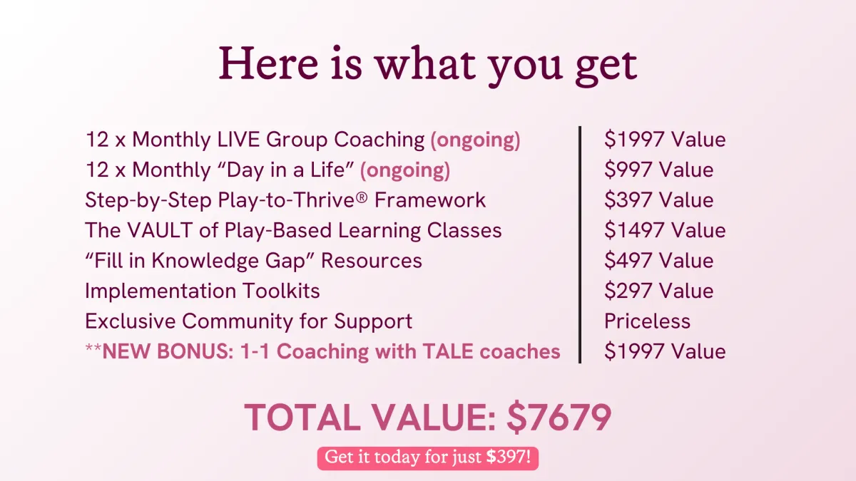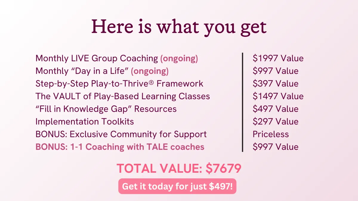 Alongside the program, you’ll have access to 1:1 coaching with qualified play coaches and a supportive TALE community - so you can ask questions, get guidance, and feel supported as you apply what you’re learning in real life.